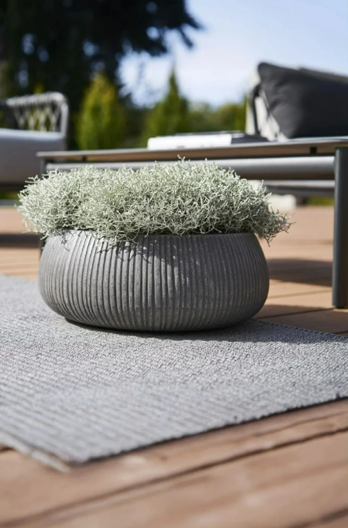 Rad ORYVEN sa vyznačuje extrémne plochým, kruhovým tvarom s harmonicky zaobleným dnom. Rovnako ako predtým zobrazené misky je všetkých šesť variant vyrobených z odolného sklolaminátu, takže sú vhodné pre vnútorné aj celoročné vonkajšie použitie. Rozdiely spočívajú v povrchovom prevedení, farbách a veľkostiach. Tu je priame porovnanie 2 kvetináčov ORYVEN v šedej farbe, jedného s rebrovaním a druhého hladkého: