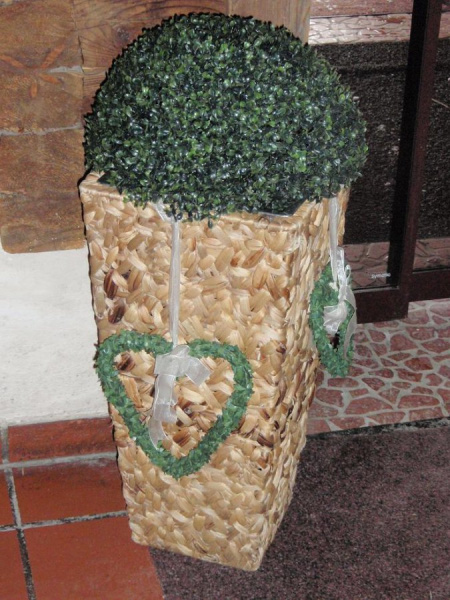 Inštalácia kvetináča Wild design, materiál vodný hyacint, pri vchode do reštaurácie. Ako dekorácia sú použité umelé kvety.