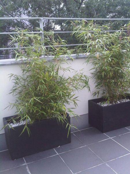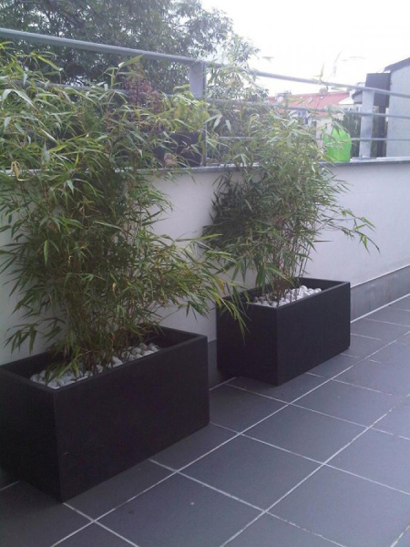 Realizácia vonkajšej terasy v Prahe. Dva sklolaminátové hrantíky Maxi široké 80 cm vo farbe antracit osadené živými kvetmi.