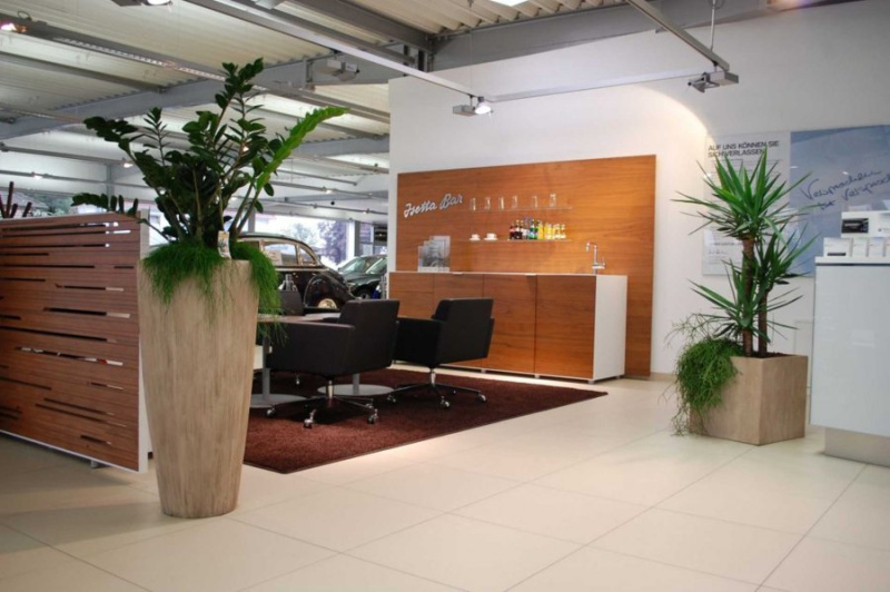 Tento autosalón sa rozhodli vybaviť našimi kvetináčmi, ktoré dodávajú interiéru sviežosť a harmóniu. Hľadali modely v béžovej farbe, aby ladili s podlahou, zapadly do celkového interiéru a nerušili či neodvádzali pozornosť od nádherných automobilov. Vybrali si vysoké kvetináče CITY 100 a BLOCK 50 zo sklolaminátu v béžovej farbe s vrúbkovaním. Rastliny v showroome sú živé a sú zasadené do plastových vložiek. Tie uľahčujú osadenie kvetináčov, zalievanie a starostlivosť o rastliny. Zelené rastliny nádherne ladia s béžovou farbou kvetináčov a tie zasa s celkovým zariadením priestoru. Výsledok pôsobí nevtieravým, elegantným dojmom, čo sa samozrejme odrazí na atmosfére vnímanej zákazníkom.