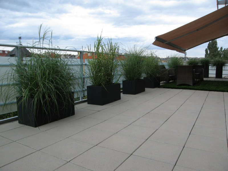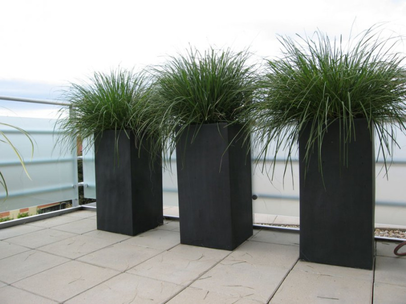 Sklolaminátové kvetináče Block design vysoké 60 cm v kombinácii s hrantíkmi MAXI širokými 60 cm vo farbe antracit na vonkajšej terase.